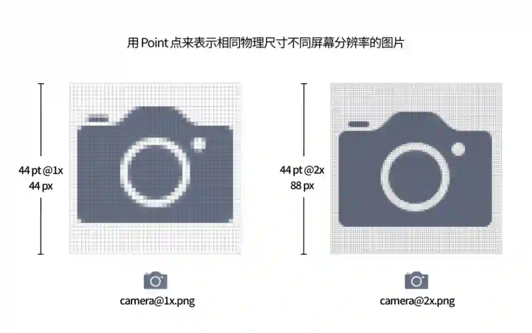设计师在进行设计时可以直接按照 44pt 的高度进行设计,设计好的图像对应导出「camera@1x.png」和「camera@2x.png」两张图片,非 Retina 屏幕的 iPhone 在显示时会自动调用第一张图片,Retina 屏幕的 iPhone 在显示时会自动调用第二张图片。