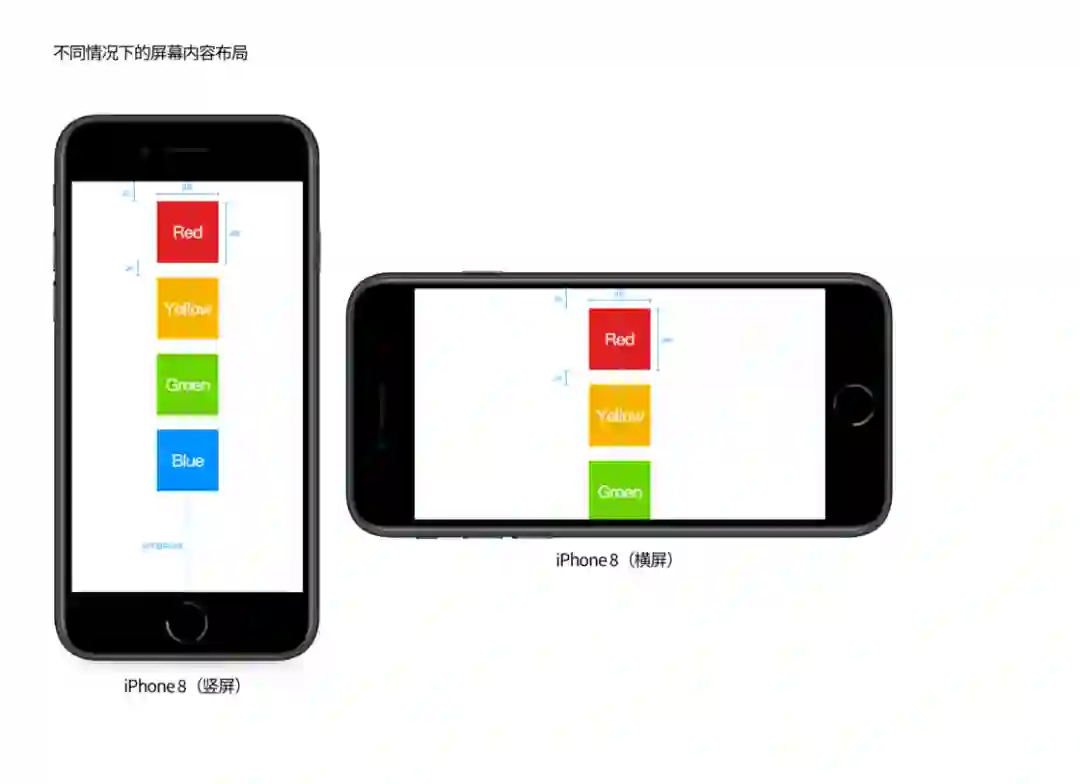第二个例子,再次回到在 Auto Layout 中提到的 app,基于已经确定的四个方块的约束关系,当在 iPhone 横屏使用时,我们会发现由于四个方块是竖直排列的,所以不能在横屏时的屏幕上显示完全,左右两侧还有较大的空间被浪费掉了。