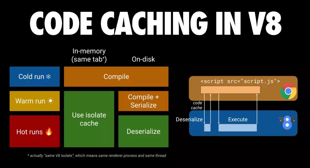V8 的(字节)代码缓存优化可以改善重复访问时的体验。首次请求脚本时,Chrome 会下载脚本并将其提供给 V8 编译,同时将文件存储在浏览器的磁盘缓存中;当第二次请求 JS 文件时,Chrome 从浏览器缓存中获取该文件,并再次将其提供给 V8 编译。但这次编译的代码被序列化,并作为元数据附加到缓存的脚本文件中。
