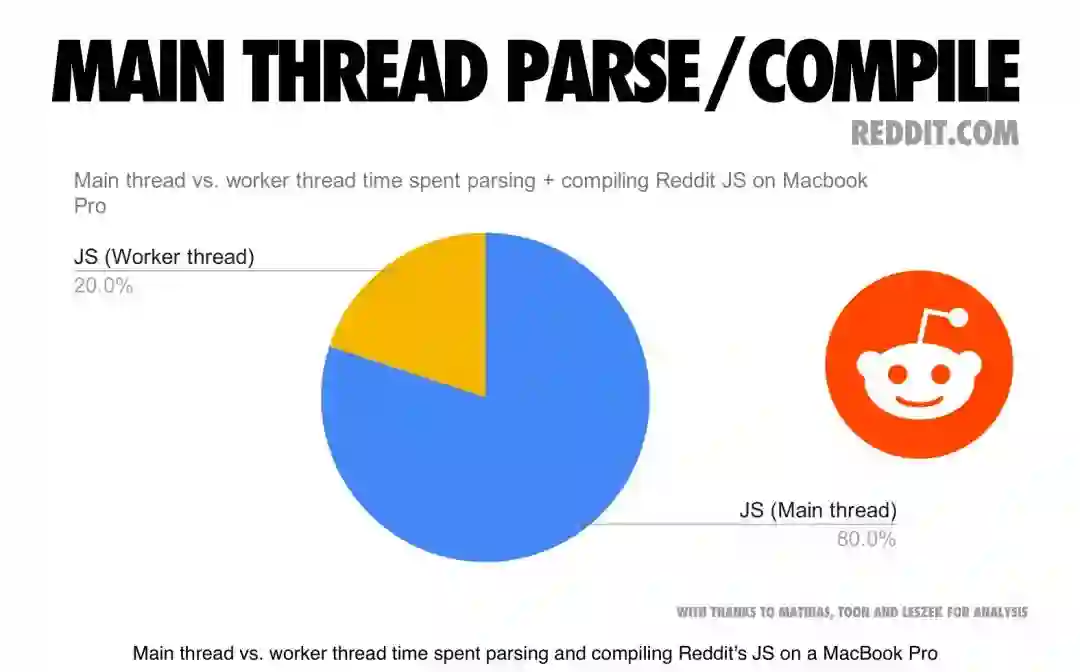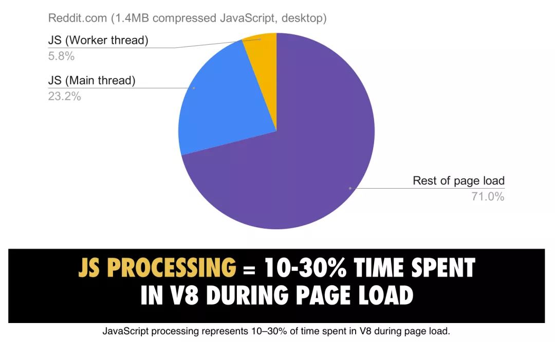 数据显示,在 Chrome 之类的浏览器中加载页面时,JS 的执行时间可以占到加载总耗时的最多 30%。下图是一台高端桌面 PC 从具有典型负载的网站(Reddit.com)中加载页面的性能分析:
