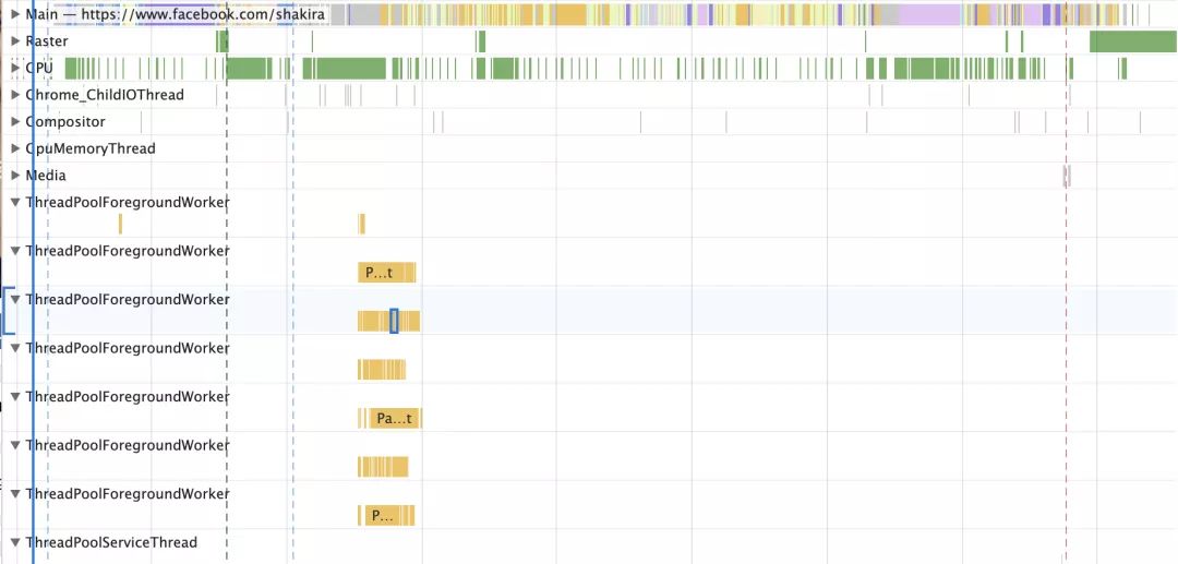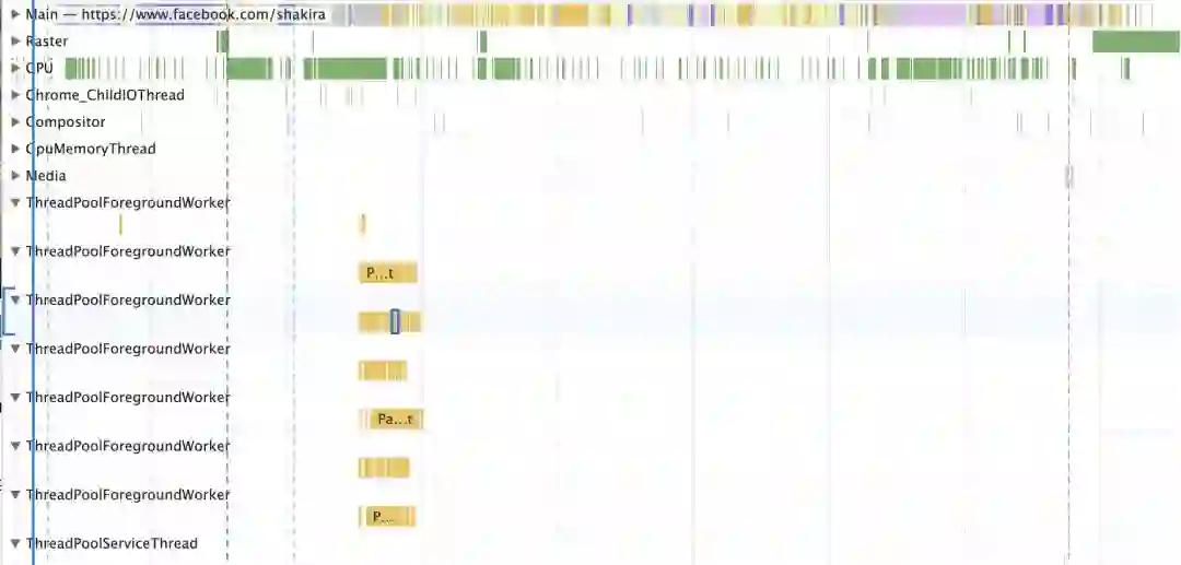然后是 Facebook.com。Facebook 使用了 292 个请求,加载了大约 6MB 的压缩 JS 脚本,其中一些是异步的,一些是预加载的,还有一些是低优先级的。他们的许多脚本都不大,粒度也很小,所以能并行流解析和编译,改善 Background/Worker 线程上的整体并行化表现。