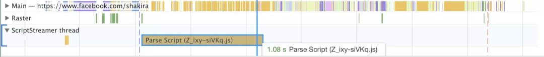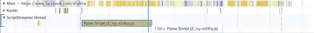如图,“解析脚本”任务需要 1.08 秒时间。但是解析 JavaScript 其实没那么慢才对!大部分时间都是在干等数据通过主线程而已。