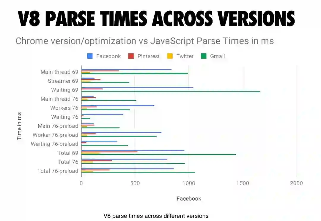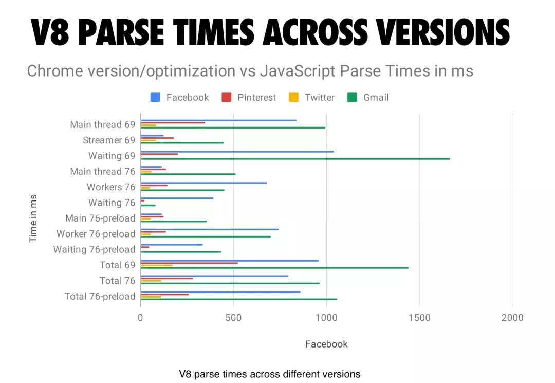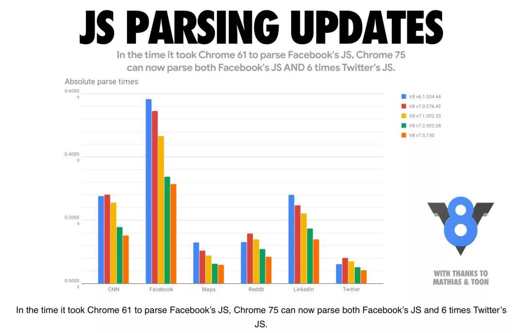 相比 Chrome 60 版本,现在 V8 引擎的 JS 解析速度提高了两倍。Chrome 还做了一些优化工作让解析和编译工作并行化,现在这部分性能开销已经不再是影响体验的关键因素了。