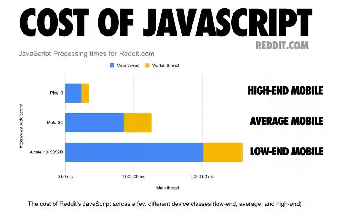 在移动端,典型的中端手机(Moto G4)执行 Reddit 的 JS 脚本耗时足足是高端手机(Pixel 3)的 3-4 倍之久,而低端手机(售价低于 100 美元的阿尔卡特 1x)的耗时更是有 6 倍之久: