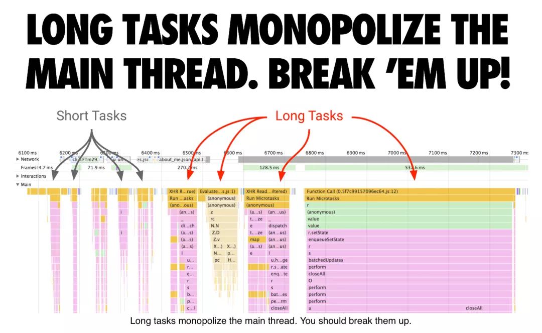 如果你要着手优化 JS 脚本的执行时间,请留意可能长时间独占 UI 线程的长任务。就算页面看起来已经准备就绪了,这些长任务也可能拖累关键任务的执行。你可以把这些长任务拆分开来,并安排好各个小任务的加载优先级,这样就能加快页面响应并降低输入延迟。