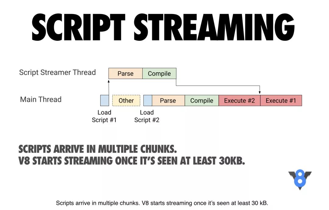 实际使用中,大多数网络条件下 V8 的脚本解析速度都比下载更快,所以脚本下载完毕后几毫秒之内 V8 也完成了解析和编译工作。