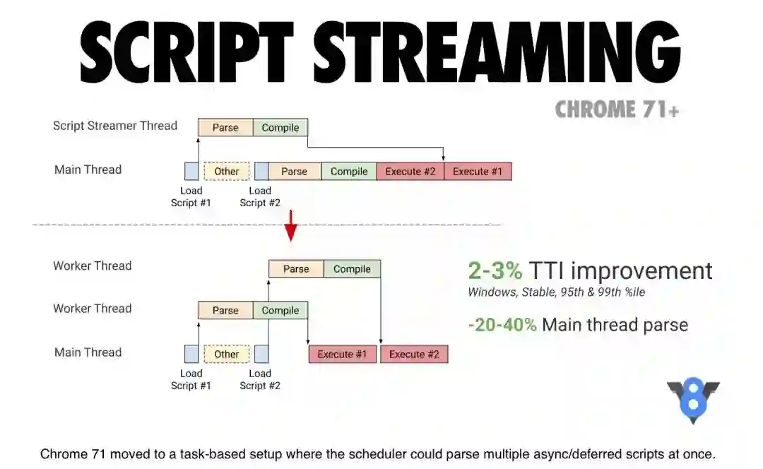 下面来深入了解一下这些优化的细节。简而言之,现在脚本资源可以在 worker 线程上流式解析和编译,这意味着: