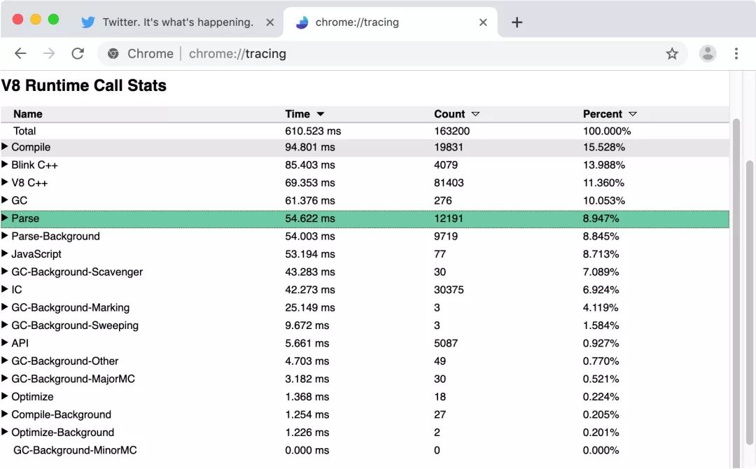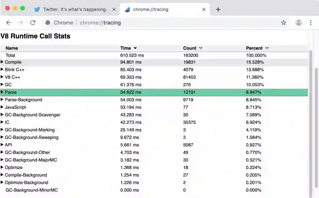 一般来说,DevTools 性能窗格非常适合从宏观层面分析你的页面。如果你需要了解更具体的 V8 性能指标(如 JavaScript 解析和编译时间),我们建议使用 Chrome 跟踪和运行时调用统计(RCS,https://v8.dev/docs/rcs)。在 RCS 结果中,Parse-Background 和 Compile-Background 会告诉你在主线程之外解析和编译 JavaScript 所花费的时间,而 Parse 和 Compile 是针对主线程的指标。