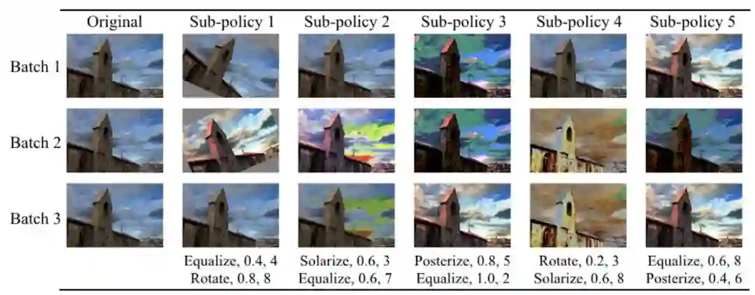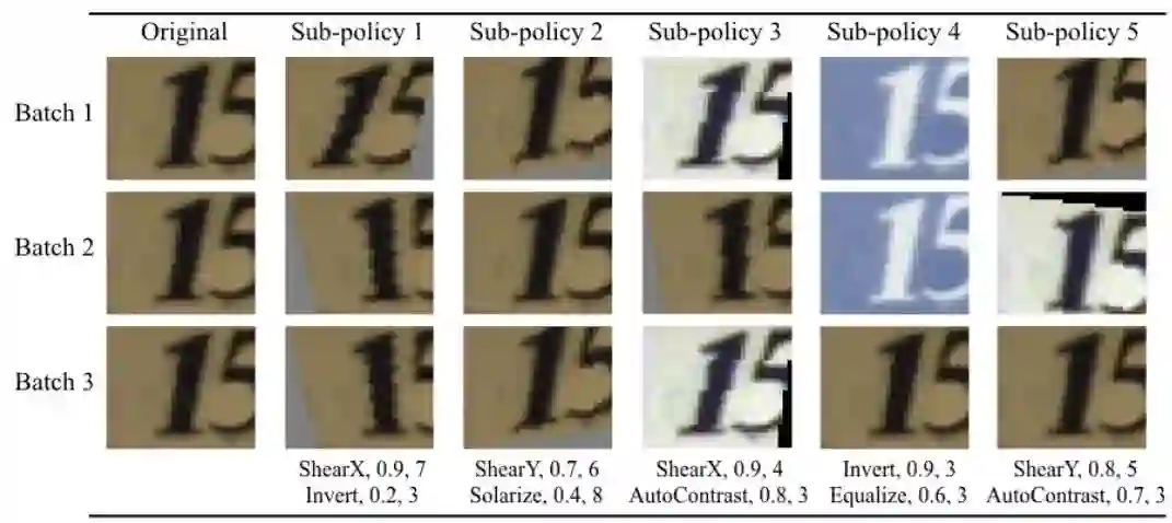 子策略1在x的方向上,以90%的概率执行力度为7的剪裁。然后,有20%的概率,对图像的颜色进行翻转。子策略4以90%的概率对图像进行颜色反转,然后在10次中有6次进行颜色直方图均衡化。操作的次数是固定的,但是由于子策略的随机性和操作存在的概率,对于单个图像也可能有很多的增强结果。