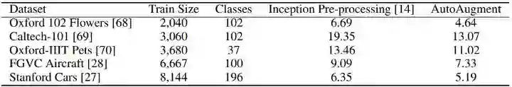 将最佳的ImageNet增强策略应用于不同的数据集,可以将5个数据集中的3个的错误率平均降低18.7%。在另外两个数据集上,错误率平均增加了5.3%。