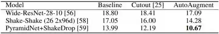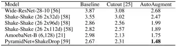 在CIFAR-10上发现的最佳增强策略可以将CIFAR-100的错误率从12.19%提高到10.67%。