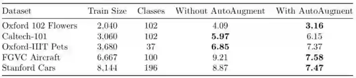 为了回答这个问题,我使用了相同的5个FGVC数据集(Oxford 102 Flowers, Caltech-101, Oxford- iiit Pets, FGVC Aircraft和Stanford Cars),对Inception v4进行微调,使用或不使用来自AutoAugment的ImageNet策略。