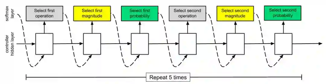 控制器以Softmax输出要应用于哪个操作决策。然后,该决策作为输入传递到控制器的下一步,这是因为控制器是一个RNN(对于NASNet,使用了一个包含100个隐藏单元的LSTM)。然后控制器决定应用哪个幅值的操作。第三步是选择概率。因此,控制器拥有所有其他操作的上下文、早期的概率和幅值,以便做出最佳的下一个选择。(这是一个说明性的例子,因为这篇论文目前并没有告诉我们选择操作、大小和概率的顺序)。