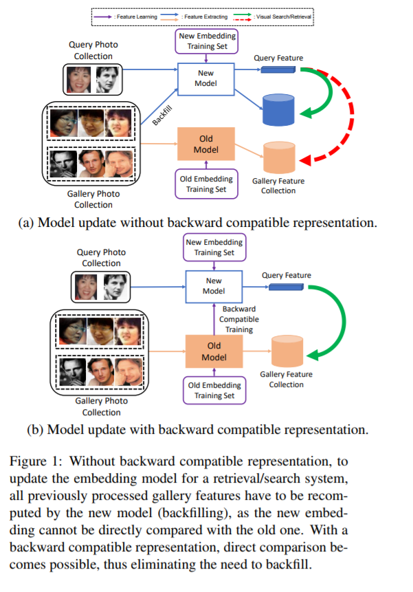我们提出了一种学习视觉特征的方法,即使这些特征具有不同的维数,并且是通过不同的神经网络结构和损失函数来学习的,也能与之前的计算结果相兼容。兼容意味着,如果这些特性用于比较图像,那么“新”特性可以直接与“旧”特性进行比较,因此它们可以互换使用。这使得视觉搜索系统在更新嵌入模型时,可以绕过计算所有以前看到的图像的新特性,这个过程称为回填。向后兼容性对于快速部署新的嵌入模型至关重要,这些模型利用了不断增长的大规模训练数据集和深度学习体系结构和训练方法的改进。我们提出一个框架来训练嵌入模型,称为向后兼容训练(BCT),作为向后兼容表示学习的第一步。在人脸识别的嵌入学习实验中,使用BCT训练的模型在不牺牲精度的前提下,成功实现了向后兼容,实现了可视化嵌入的无填充模型更新。