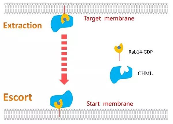 图示: CHML与Rab14相互作用,并辅助Rab14上膜,从而影响Rab14运输囊泡中肝癌转移相关分子的膜定位。