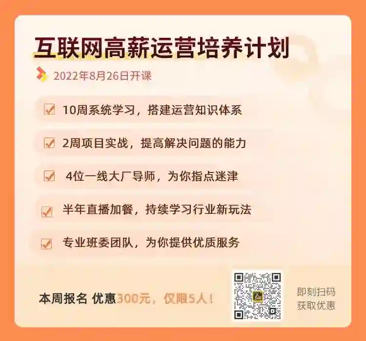 今天给大家推荐《互联网高薪运营培养计划》,用10周时间,从0-1,补齐各个模块的能力,搭建起运营系统知识体系,为升职加薪做好充足准备!