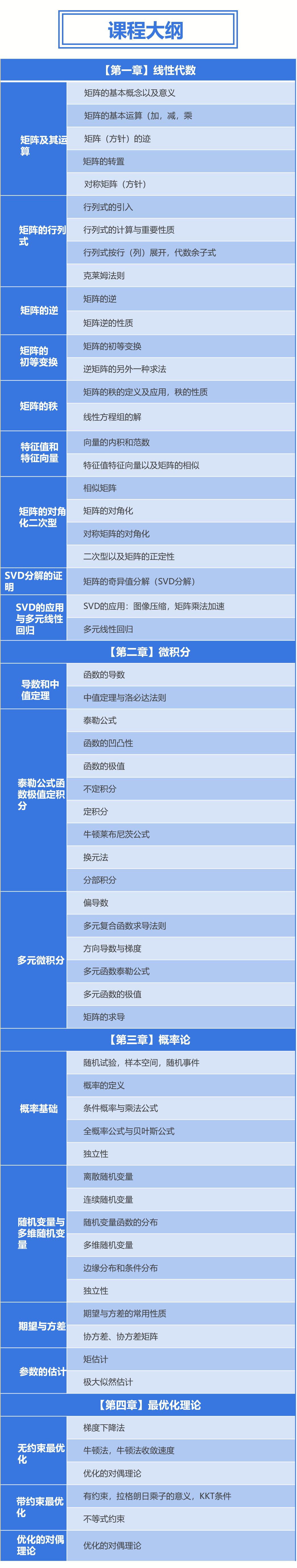 今天的种种人工智能技术归根到底都建立在数学模型之上,要了解人工智能,首先要掌握必备的数学基础知识,具体来说包括: