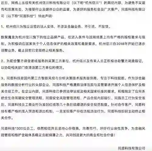 而今日(9月27日),据宅客频道称:蒋涛被逼的发了一份公共声明,同盾又一次为此数据魔盒“出头辟谣“,表示同盾科技旗下杭州信川科技公司不涉及金融业务、不引流、不放贷,同时杭州信川相关人员也正积极协助警方调查第三方单位情况,一旦发现客户违规行为,同盾科技立即终止合作。(具体如下)