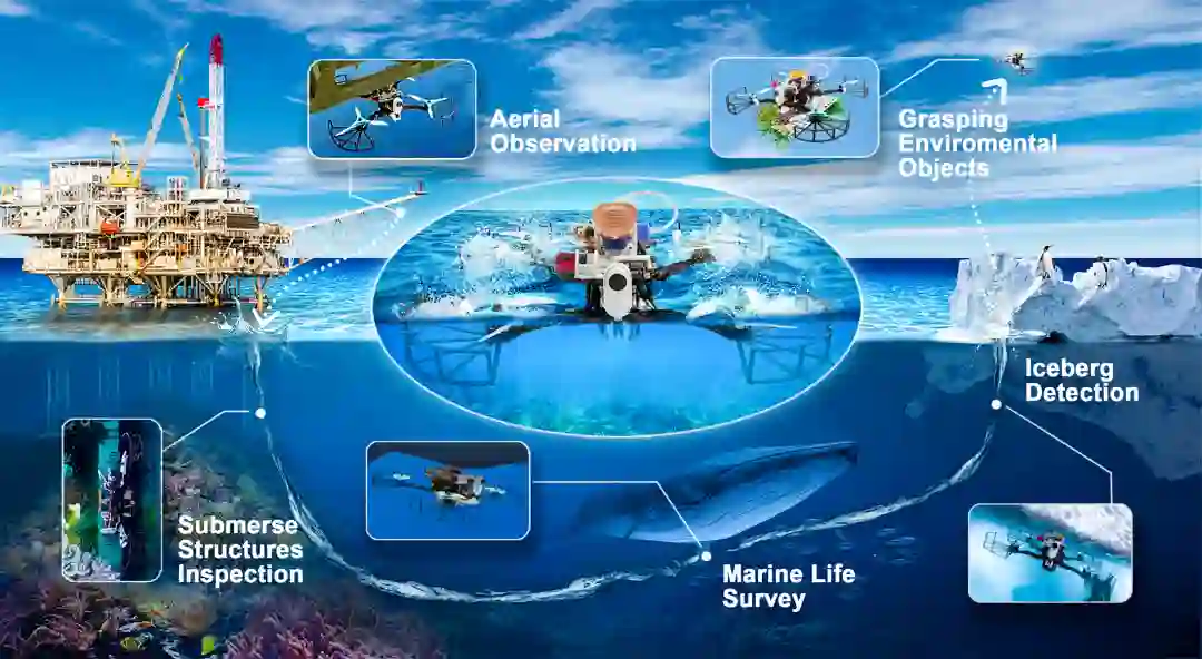 机器人在高度非结构化环境中的应用,比如进行多地形观测、多介质作业、多环境探查等,非常需要机器人具备快速跨介质运动(扩大工作范围)和高效暂栖(延长工作时间)的能力。