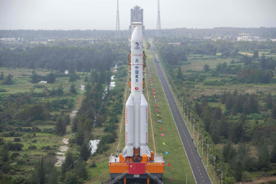 图注:长征五号用于执行深空探测任务。这是准备发射嫦娥五号时的情景,可见整流罩上标有中国探月logo。