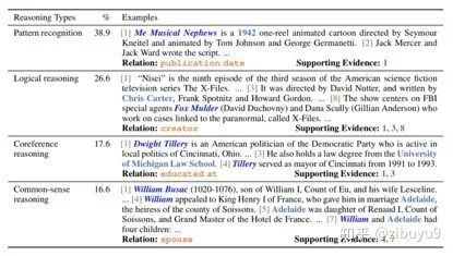 为了推动文档级关系抽取的研究,课题组姚远同学等 [30] 提出了DocRED数据集,是一个大规模的人工标注的文档级关系抽取数据集,基于维基百科正文和WikiData知识图谱构建而成,包含5,053篇维基百科文档,132,375 个实体和53,554 个实体关系事实,是现有最大的人工标注的文档级关系抽取数据集。如下图所示,文档级关系抽取任务要求模型具有强大的模式识别、逻辑推理、指代推理和常识推理能力,这些方面都亟待更多长期的研究探索。