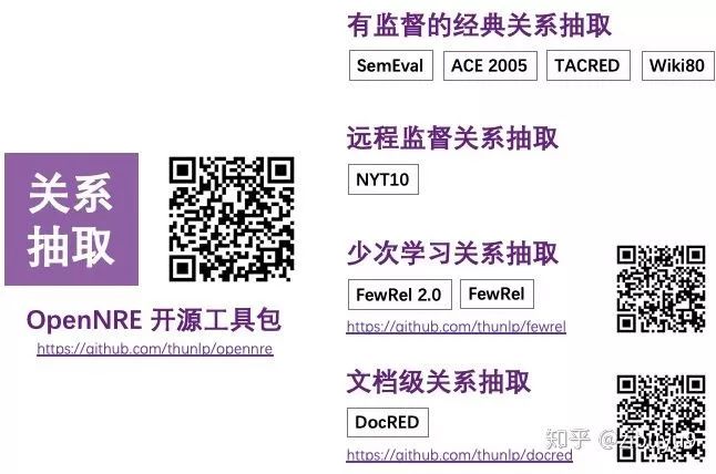 我们课题组从2016年开始耕耘实体关系抽取任务,先后有林衍凯、韩旭、姚远、曾文远、张正彦、朱昊、于鹏飞、于志竟成、高天宇、王晓智、吴睿东等同学在多方面开展了研究工作。去年在韩旭和高天宇等同学的努力下,发布了OpenNRE工具包 [33],经过近两年来的不断改进,涵盖有监督关系抽取、远程监督关系抽取、少次学习关系抽取和文档级关系抽取等丰富场景。此外,也花费大量科研经费标注了FewRel (1.0和2.0)和DocRED等数据集,旨在推动相关方向的研究。