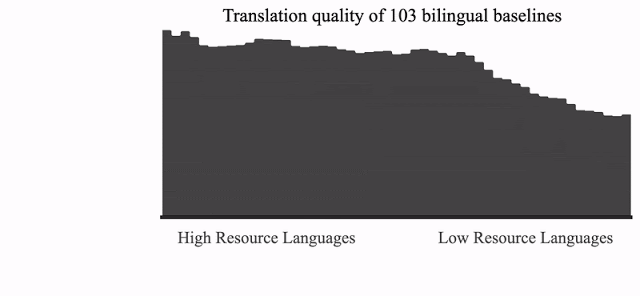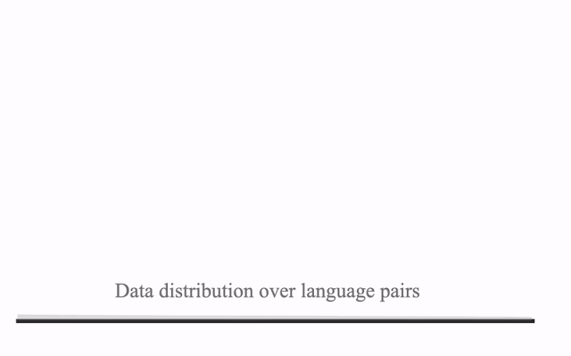 尽管从大语种到小语种的数据倾斜是 NMT 领域的一项巨大挑战,但它也为研究 语言迁移 创造了理想场景 :我们可以将训练一种语言获得的数据分析结果应用于其他语言的翻译。在数据分布中,一端为法语、德语和西班牙语等语料丰富语言,其中包含数十亿个并行样本;而另一端为约鲁巴语、信德语和夏威夷语等语料稀少语言的监督学习数据,只包含几万个样本。