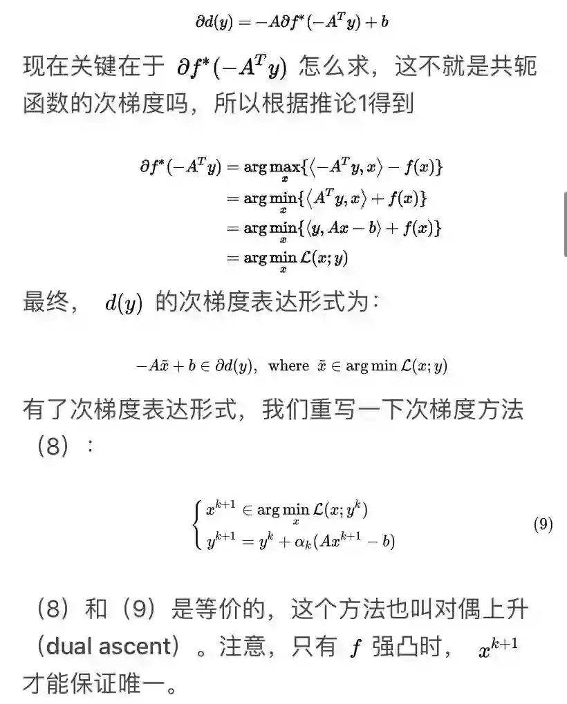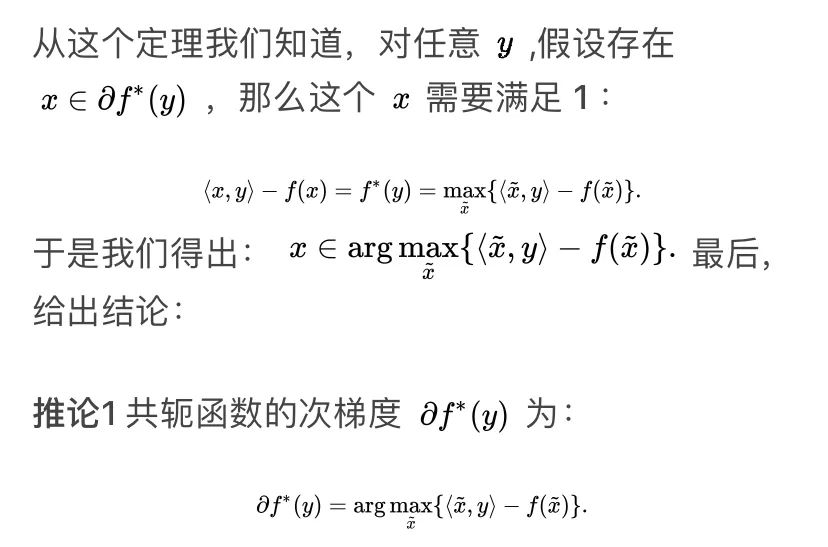 接下来我们分析下共轭函数的一些性质,这将会在对偶方法中的推导起到关键的作用。因为对偶问题中目标函数就是原问题目标函数的共轭形式。所以我们要研究一下共轭函数的次梯度,以及什么情况下光滑。
