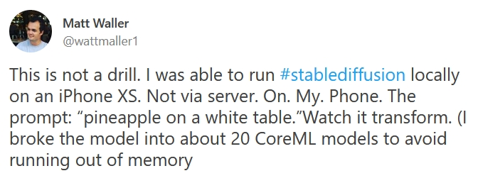 现在,容易优化的地方都已优化完毕,于是有人开始担心:继续优化下去的投入产出比会越来越低,但后来这种担心不攻自破。8月份时,Stable Diffusion可以在内存为5~10GB的GPU上运行——商用GPU的内存一般为6~12GB,苹果产品都有统一内存(Unified Memory)。到了9月,Stable Diffusion已能在iPhone XS上运行。