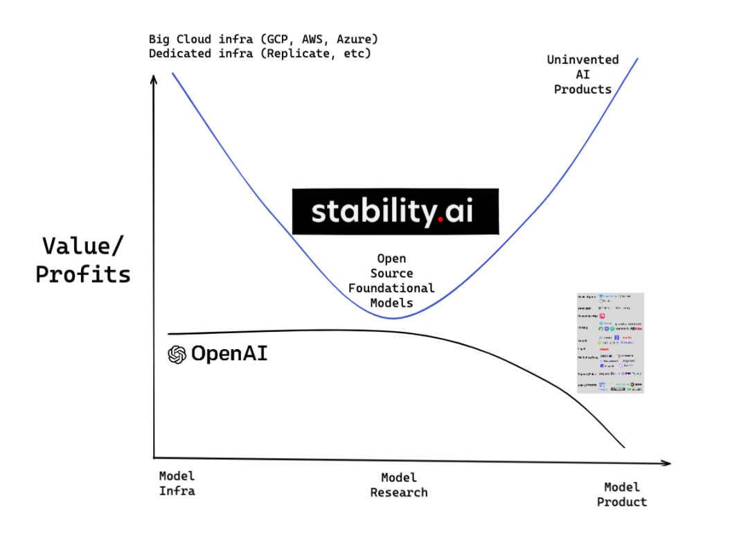 Stability AI的既定目标是成为非营利性参与者,这就使它压低了拥有专有基础模型研究的经济价值,但同时这可以扩大AI的总TAM(Total Addressable Market,总可用市场):