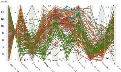 平行坐标图让你可以交互式地分析数据,通过每列上的笔刷过滤数据。点击Explore/Filter(探索/过滤)按钮可以在探索和过滤模式间切换。在过滤模式下,可以通过调节笔刷的起止(缩放尺寸和移动位置)过滤数据。在探索模式下,悬浮鼠标可以查看单独的数据点。