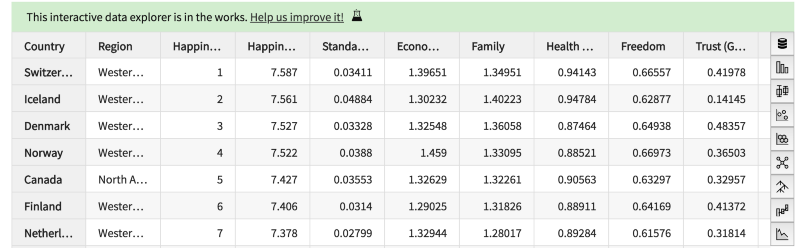 我们将使用世界幸福感报告作为样本数据集。你可以在nteract亲自尝试,或者通过mybinder在线浏览(可能需要30秒加载notebook):