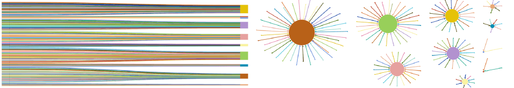 Semiotic的设计方式意味着实现多样性的图表相当容易。例如,<NetworkFrame>不仅可以用来显示力导向网络,还可以用来显示许多不同的面向拓扑的图标,包括dendrogram、矩形树图、桑基图、circle packing。