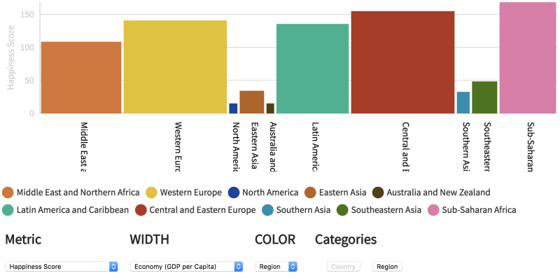 需要注意的是聚合只是简单的相加,因此选中Region(区域)时,得到的是该区域的幸福度总值,也就是说,该区域内的国家越多,这一区域的幸福度越高。如果想要准确地比较不同区域的幸福度,我们应该使用总结图。