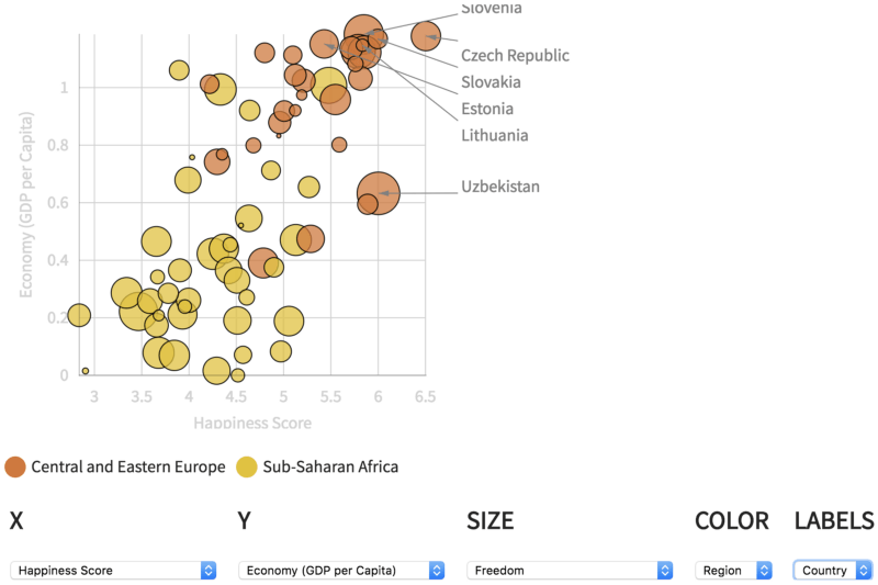 第三个模式是散点图,其中提供了尺寸编码的选项(如果你觉得需要创建气泡图的话)。另外,鼠标悬浮同样可以查看单个数据点的数值。散点图还为排名靠前的数据点提供了初步的注释。