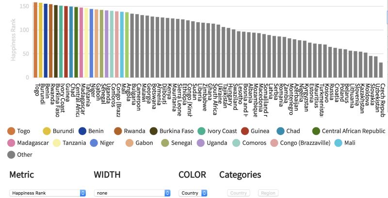 第一个模式是柱状图。每个柱形都可以交互。不过出于清晰考虑,只有数值最高的那些柱形是彩色的。通过Metric(测度)下拉菜单可以指定不同的测度作为纵轴。