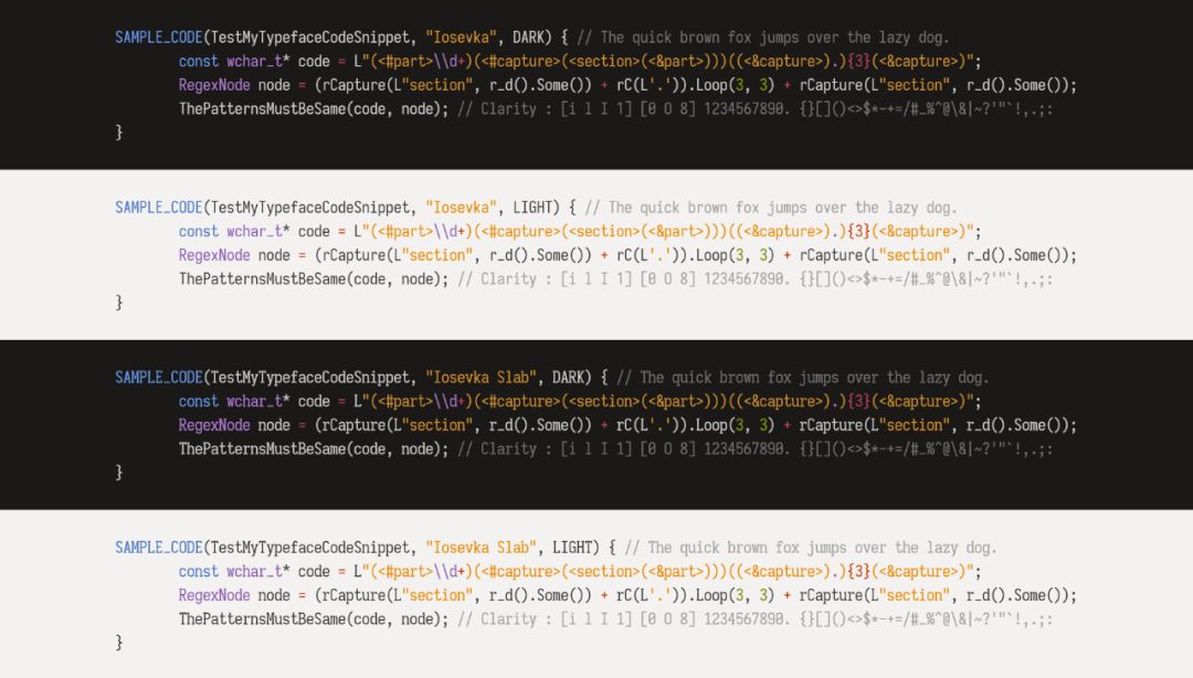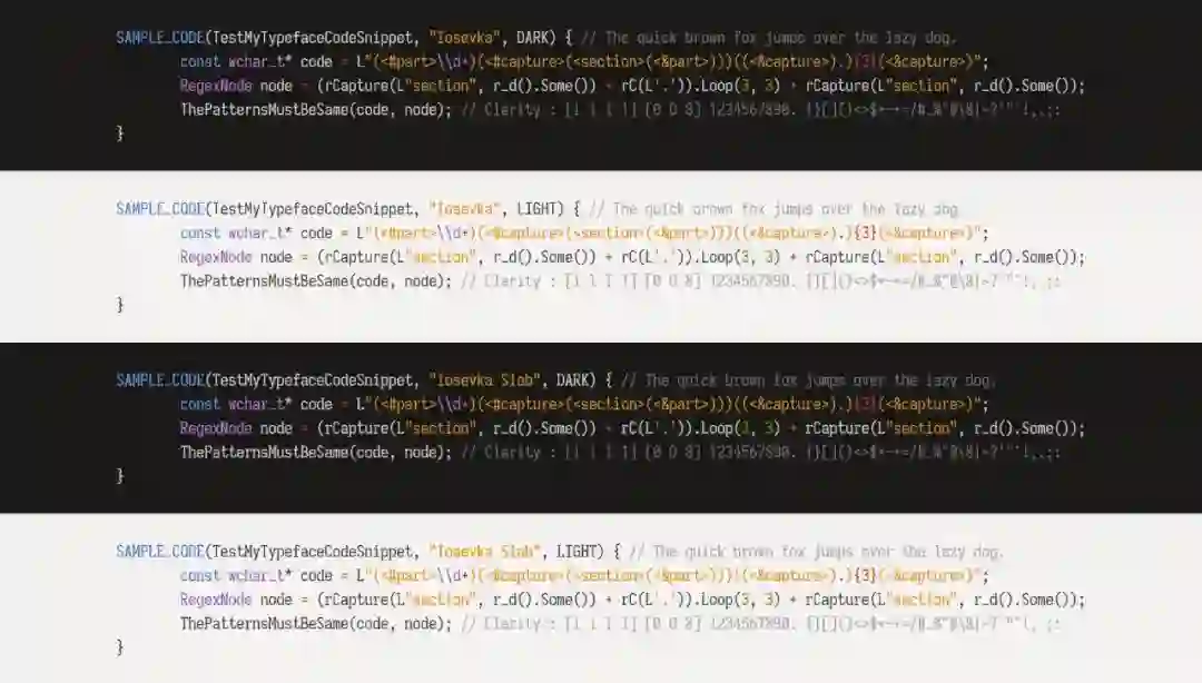 Iosevka 是一款由 be5invis 大佬开发的开源字体。它支持了 15 种不同的样式(可前往 GitHub 仓库中预览),还支持连字特性(ligatures)。同时,be5invis 还将 Iosevka 和 Source Han Sans(思源黑体)合成为了一个等宽的支持 CJK(中日韩语言)的字体 Sarasa Gothic 更纱黑体。