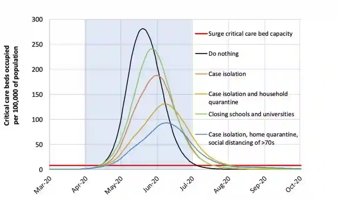 在研究人员的模型中,这是无效的。他们指出,如果不对整个人群采取相应的社交禁令,即使是隔离重症患者和老人、关闭学校,这些同样将导致感染人数激增,最终感染的人数会达到英美医疗系统所能承受的8倍。