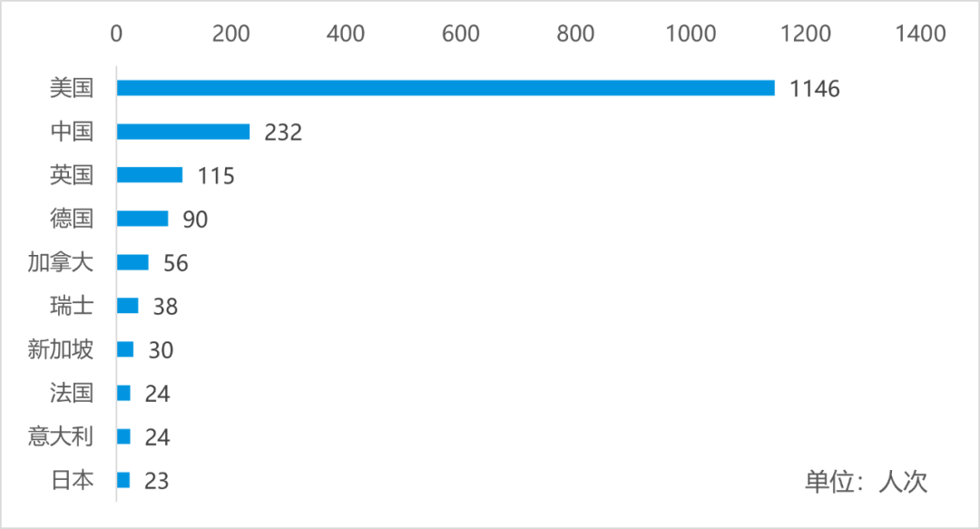 一、美国入选 1146 人次,占全球 57.3%,是排名第二的中国的 5 倍