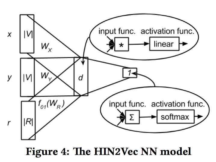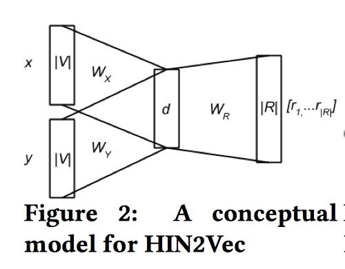 不同于之前很多基于 Skip-gram 语言模型的工作,HIN2Vec 的核心是一个神经网络模型,不仅能够学习网络中节点的表示,同时还学到了关系(元路径)的表示。
