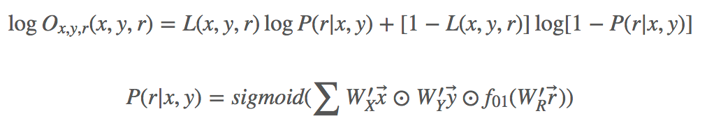 模型的训练数据集是以四元组的形式给出的,形如 $,其中,其中 L(x,y,r) 指示指示 x,y 之间是否存在关系之间是否存在关系 r。具体的: