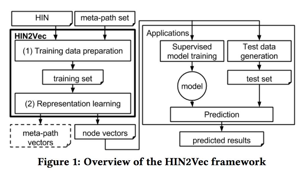 提出了 HIN2Vec 模型,包括两部分:首先,基于随机游走和负采样生成训练数据,然后,设计逻辑二元分类器用于预测两个给定的节点是否存在特定的关系。同时,考虑了循环序列、负采样和正则化问题。