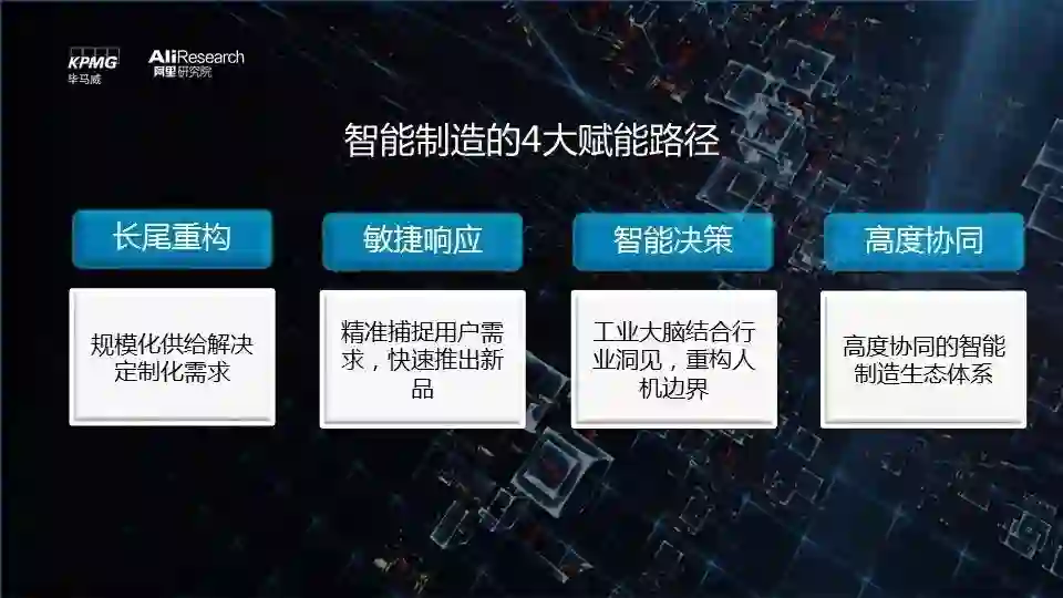 报告通过深入研究,并结合淘工厂、恒逸石化、中信云等企业案例,总结了智能制造的四条赋能路径及其为企业带来的巨大价值:1.规模化供给解决定制化需求,实现长尾重构;2.精准捕捉用户需求,快速推出新品,实现敏捷响应;3.工业大脑结合行业洞见,重构人机边界,实现智能决策;4.工业互联、云中台助力大型集团构建高度协同的智能制造生态体系。