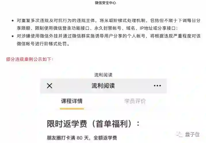 2019年5月,微信安全中心发布《关于利诱分享朋友圈打卡的处理公告》,并再次明确《微信外部链接内容管理规范》,要求禁止通过利益诱惑,诱导用户分享、传播外链内容或者微信公众帐号文章。
