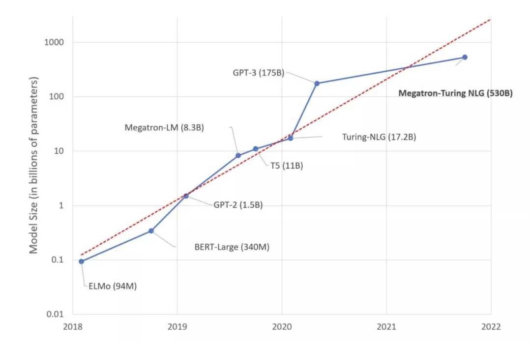 紧接着,OpenAI在2019年初推出15亿参数的GPT-2,英伟达推出威震天(Megatron-LM)83亿参数,谷歌T5模型110亿参数,微软图灵Turing-NLG模型170亿参数。