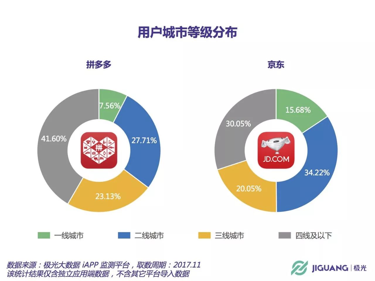 极光大数据显示,这些用户70%为女性,65%来自三四线城市,来自一线城市的用户仅有7.56%,与京东形成了鲜明对比。