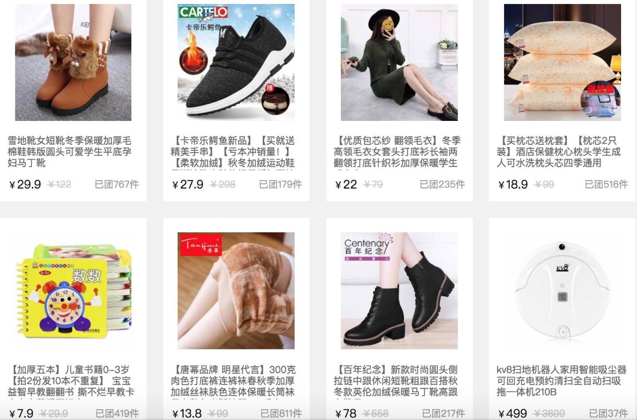 在拼多多很容易看到这样的商品:3元的抹胸,7.7元10条的内裤,8.8元的加绒打底裤,44元的冬季羽绒服……