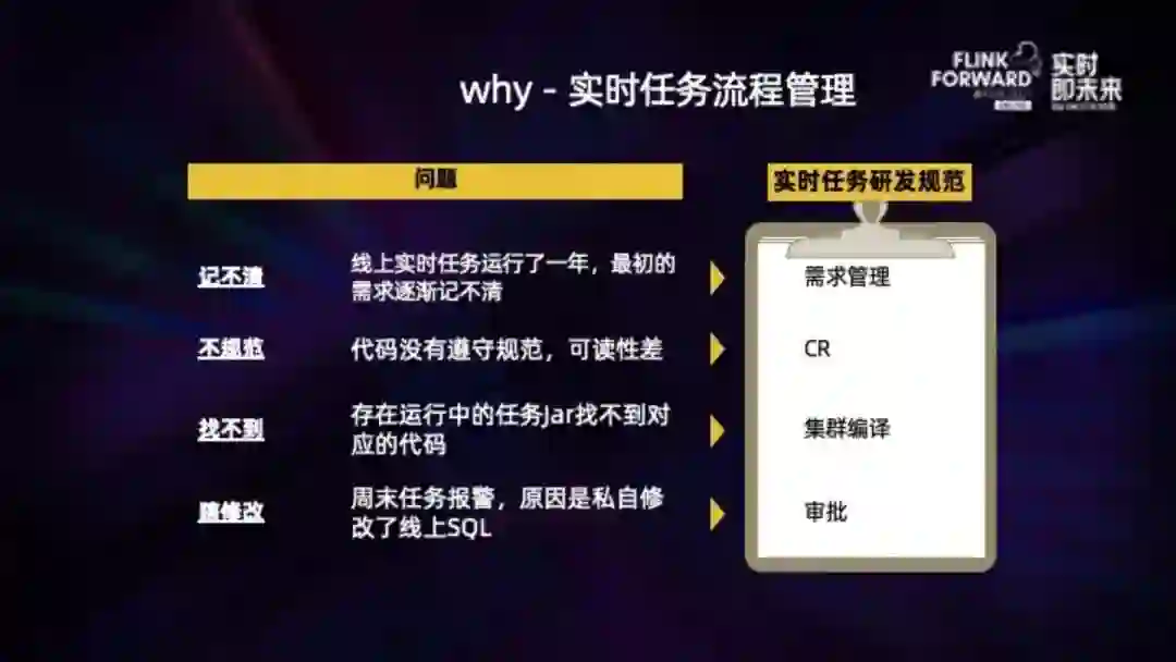 不规范:UDF 也好,DataStream 的代码也好,都没有遵守规范,可读性差,导致后面接手的同学升级改不动、或者不敢改,没法长久的维护下去。包括实时任务的 SQL 怎么写也应该有规范。