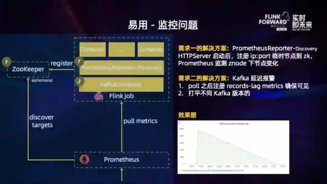 我们目前的 Flink 作业都运行在 Yarn 上。作业启动后,预期是 Prometheus 来抓取 Yarn 分配的 Container,然后对接报警系统,用户就可以基于报警系统配置 Kafka 延迟、Checkpoint 失败这些报警。在搭建这条通路时主要遇到了两个问题: