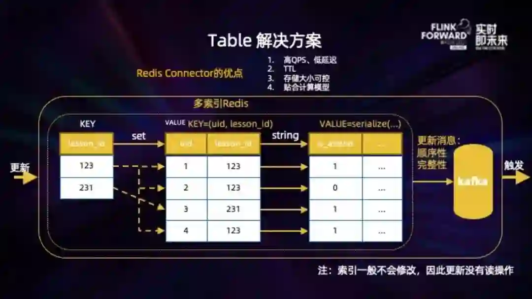 触发消息:写入 redis 后,会同时写入一条更新消息到 Kafka. 两个存储之间的一致性、顺序性、不丢数据都在 Redis Connector 的实现里保证。
